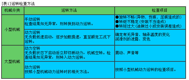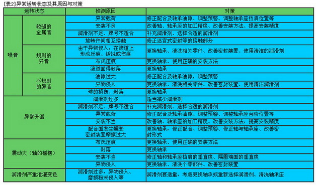 · 軸承安裝后,應(yīng)立即進行運轉(zhuǎn)檢查,以確認安裝是否正確。[表1]給出了運轉(zhuǎn)檢查的方法。若在運轉(zhuǎn)檢查中發(fā)現(xiàn)異常,應(yīng)立即停機,對機器進行檢查,常見問題的產(chǎn)生原因及對策參見[表2]。