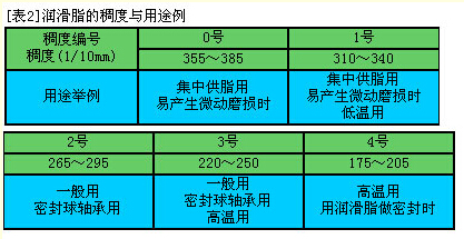 1.脂潤滑脂潤滑是由基礎(chǔ)油、增稠劑及添加劑組成的。使用時(shí),應(yīng)選擇適合于軸承使用條件的潤滑脂。即使是同類潤滑脂,由于生產(chǎn)廠家及商標(biāo)不同,性能上可能會(huì)有較大的差別。在選擇的時(shí)候要特別注意。潤滑脂的稠度與用途的例子參見[表2]