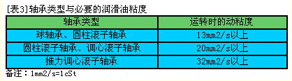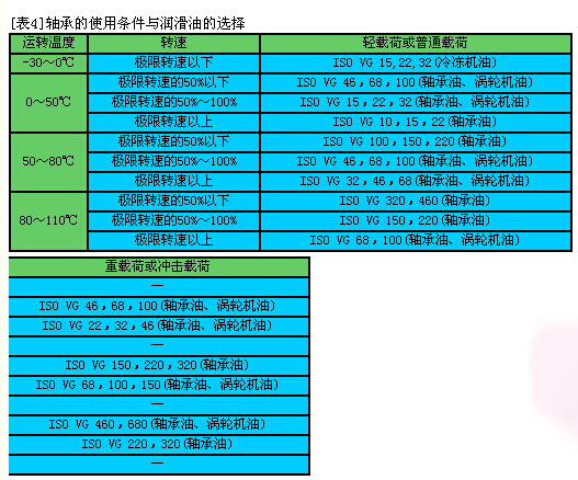2.油潤滑油潤滑方法有油浴、滴油潤滑、飛濺潤滑、循環(huán)供油、噴射潤滑、油霧潤滑以及油氣潤滑。與脂潤滑相比,油潤滑適合于高速高溫環(huán)境下使用。特別是需要向外部散熱時(shí),采用油潤滑更為合適。對(duì)油潤滑來說,由于要考慮軸承的運(yùn)轉(zhuǎn)溫度,因此選擇適當(dāng)粘度的潤滑油十分重要。一般情況下,轉(zhuǎn)速越高,使用的潤滑油粘度越低,載荷越大,使用的潤滑油粘度越高。在普通使用條件對(duì)應(yīng)的運(yùn)轉(zhuǎn)溫度下,潤滑油的粘度基準(zhǔn)參見[表3] 作為選擇時(shí)的參考,[表1]給出了潤滑油的粘度與溫度的關(guān)系。[表4]給出了按軸承使用條件選擇潤滑油的例子。